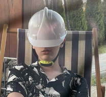 Ze względów bezpieczeństwa Kasti został obowiązkowo wyposażony w kask budowlany w stopniu kierownika budowy.